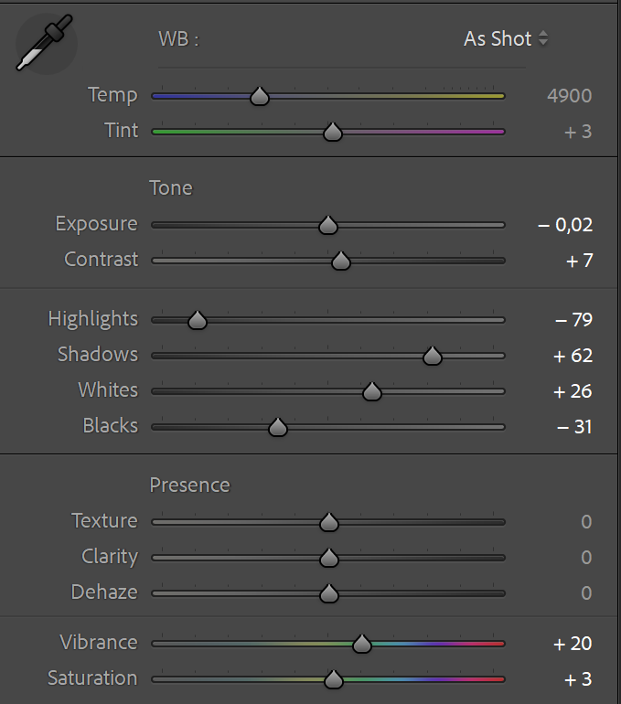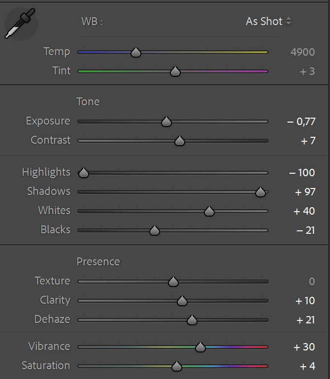 I then processed the new HDR DNG file in Lightroom Classic using the following settings: