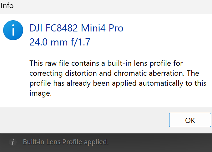 Lightroom Classic uses a lens profile integrated into the DJI Mini 4 Pro DNG file to correct distortion and chromatic aberrations in images captured by the Mini 4 Pro. This cannot be disabled in Lightroom: