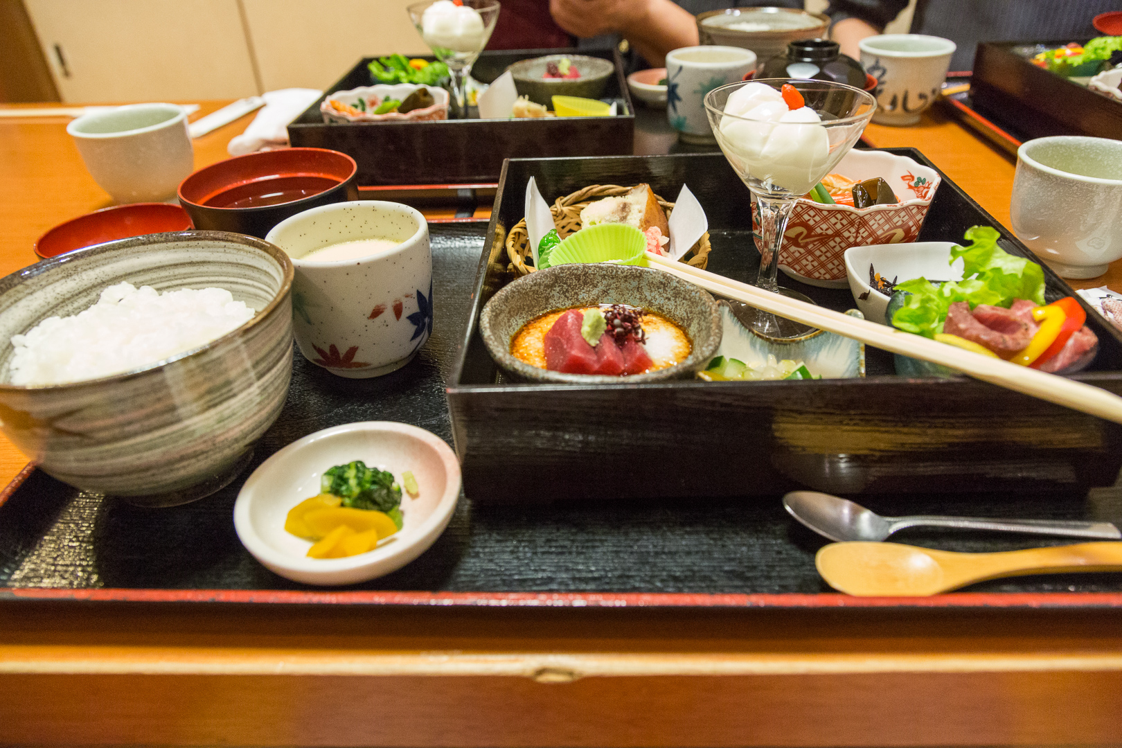 Das Essen war ausgezeichnet, jeder bekam ein Tablett mit schön angerichteten Speisen in verschiedenen hübschen Schälchen, dazu Reis und natürlich Miso-Suppe.