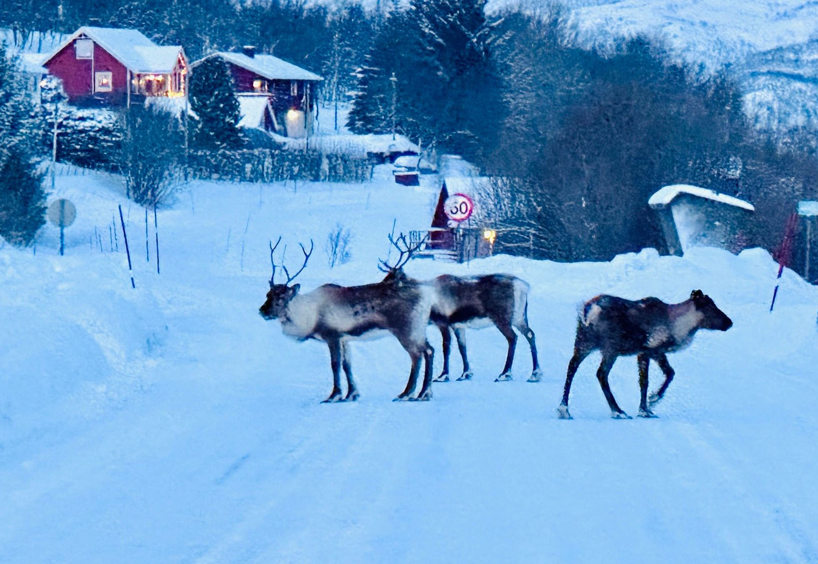 Während der Fahrt tauchten plötzlich drei Rentiere mitten auf der Straße auf. Offensichtlich kommen auch sie bei dem hohen Schnee auf geräumten Straßen besser voran. Von den vorbeifahrenden Autos ließen sie sich übrigens kaum stören.