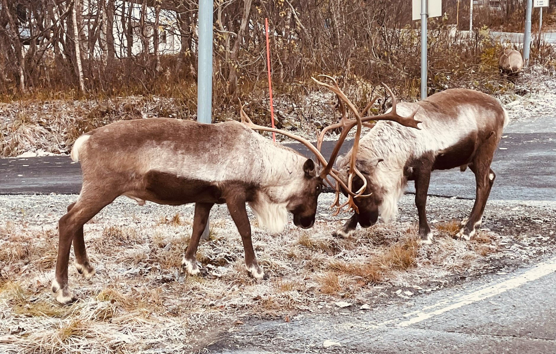 Wir haben gut geschlafen und lecker gefrühstückt, hatten ja gestern Abend noch eingekauft. Dann haben wir uns mit dem Mietwagen in Richtung Sommarøy aufgemacht. Auf dem Weg, der uns von unserem letzten Aufenthalt bekannt war, entdeckten wir zwei kämpfende Rentiere direkt an einem stark befahrenen Kreisverkehr. Sie ließen sich von den ständig vorbeifahrenden Autos nicht stören, auch nicht von einem Jogger, der keine 2 Meter von Ihnen entfernt vorbeilief. Der Jogger war aber auch von den Beiden unbeeindruckt - solche Szenen scheinen hier an der Tagesordnung zu sein.